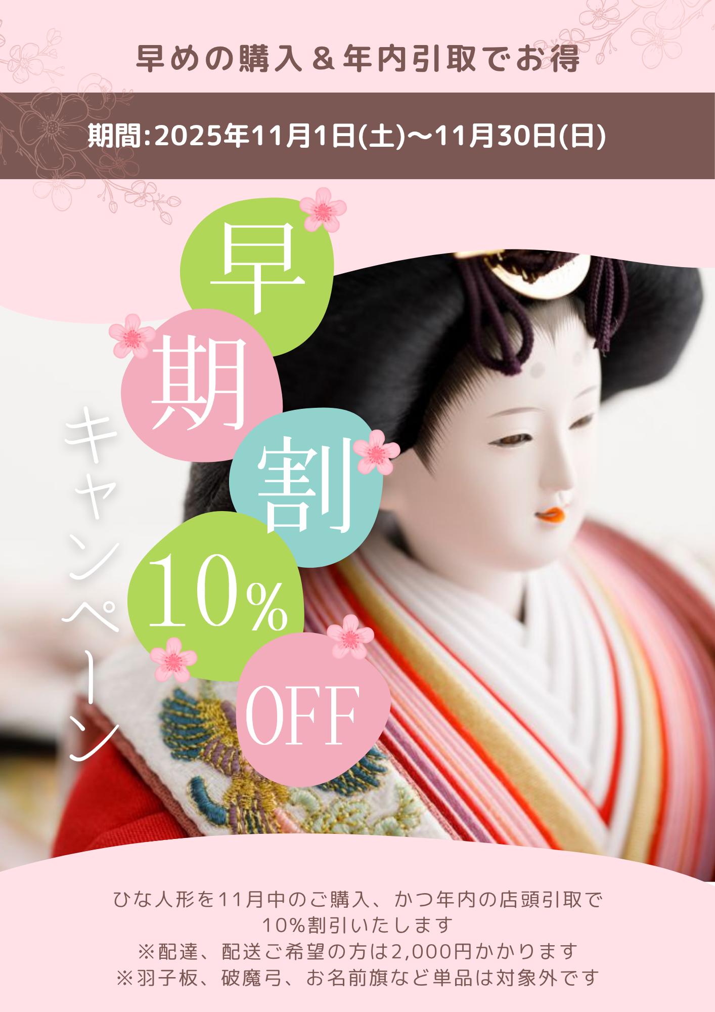 12月からの繁忙期を避け、早期にゆっくり選び少し早めにお引取のお客様に特別割引を実施いたします。